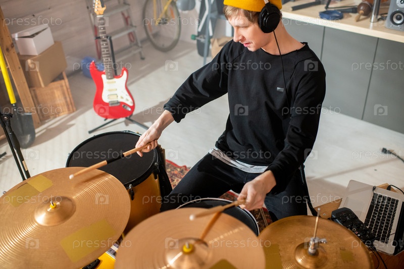 Красивый молодой музыкант в повседневной одежде бьет цембалы с деревянными барабаны