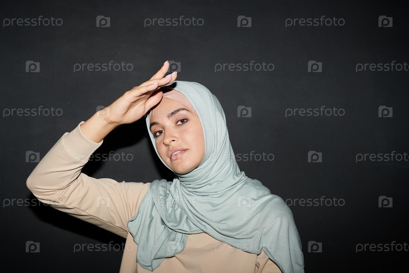 Привлекательная модная мусульманская женщина в светло-синем хиджабе позирует перед камерой на черном фоне стены, копирование пространства