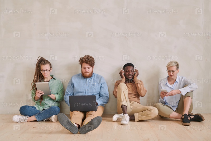 Различные молодые мультиэтнические люди сидят на полу и используют современные устройства, такие как гаджеты и ноутбуки