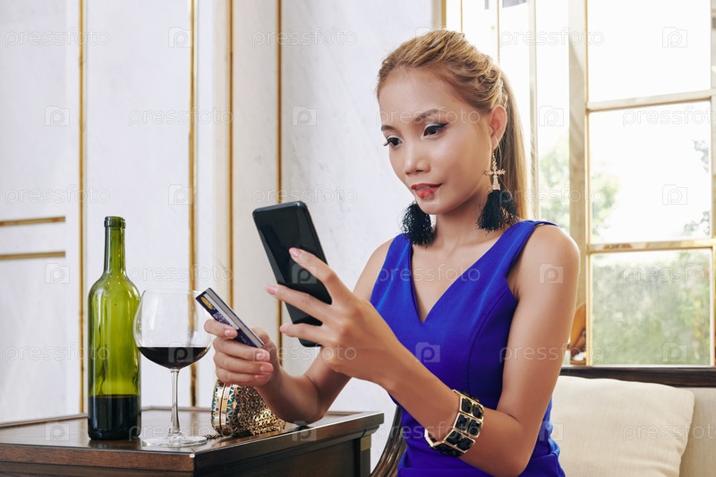Женщина покупает через мобильное приложение
