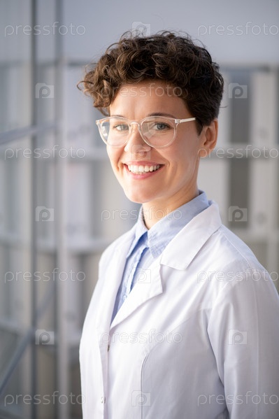 Молодая успешная женщина-ученый стоит перед камерой в научной лаборатории
