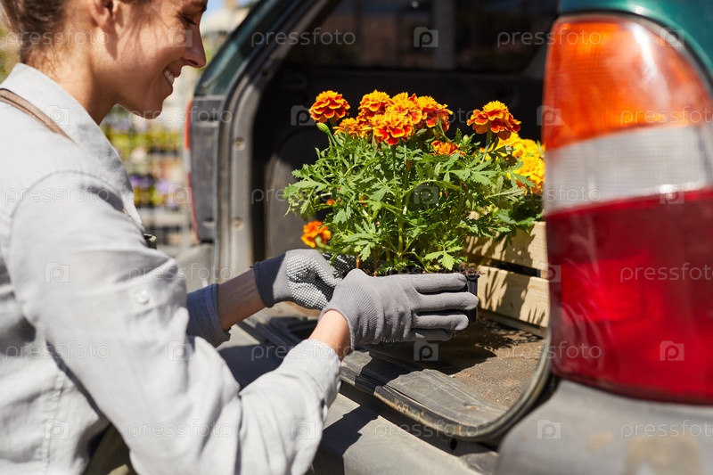 Молодая женщина-работница загружает цветы в машину