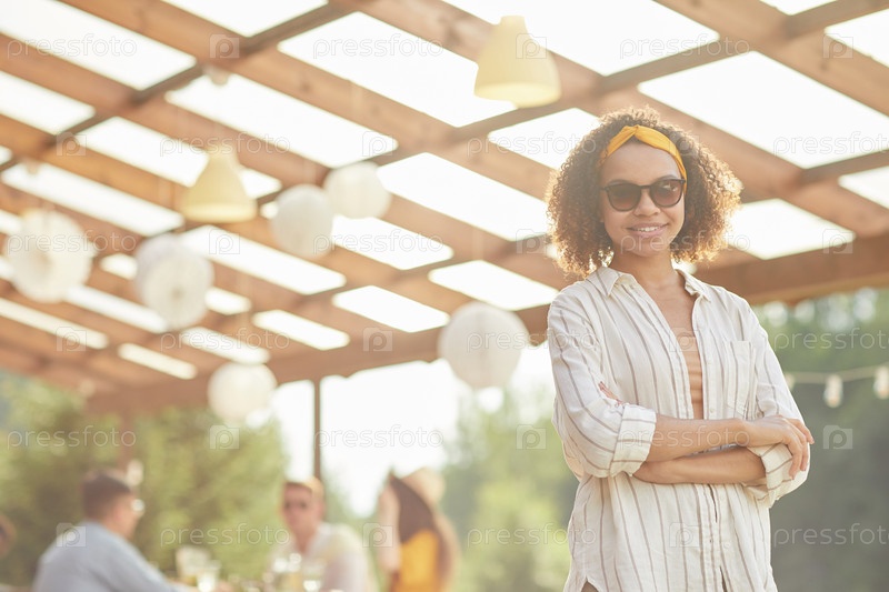 Афроамериканская женщина позирует на летней вечеринке под солнцем