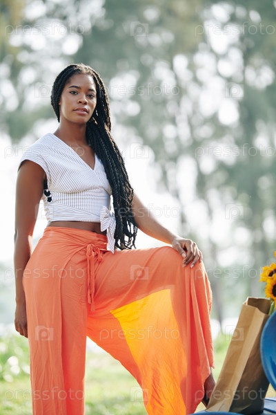 Женщина широкие оранжевые льняные брюки