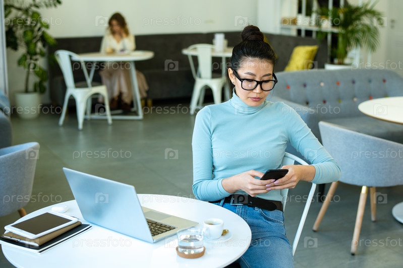 Молодая современная женщина в очках и повседневной одежде прокручивает мобильный телефон