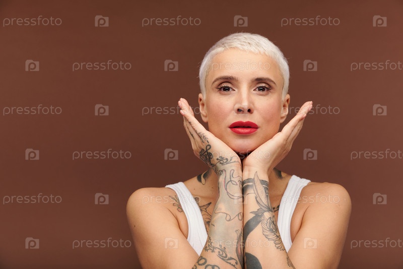 Современная молодая женщина с короткими светлыми волосами и татуировками на руках