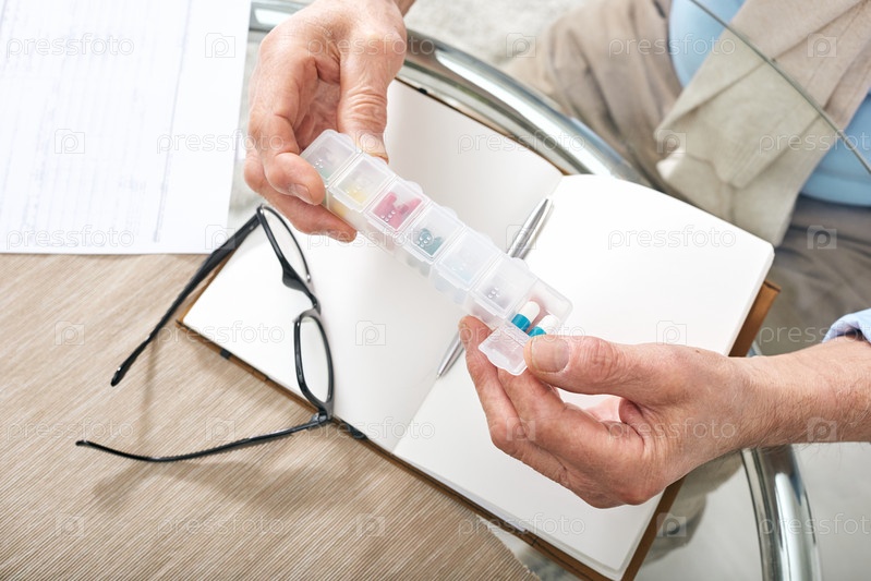 Руки мужского пенсионера, держащего пластиковый контейнер с таблетками над открытой тетрадью