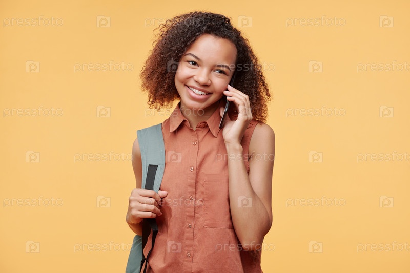 Улыбающаяся черная девушка, разговаривающая по телефону