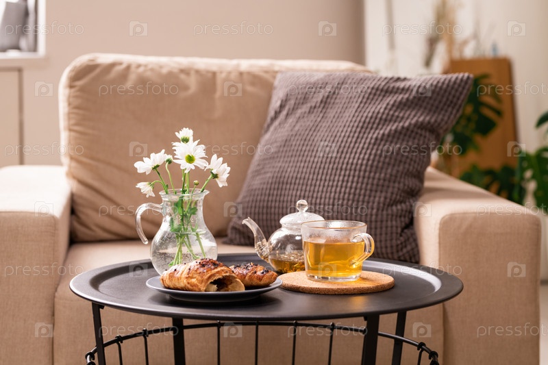 Букет белых цветов в кружке с водой, закуска на тарелке и зеленый травяной чай