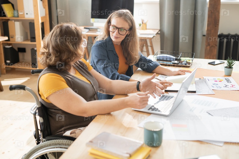 Две молодые женщины-руководители офиса сидят за столом и обсуждают рабочие моменты