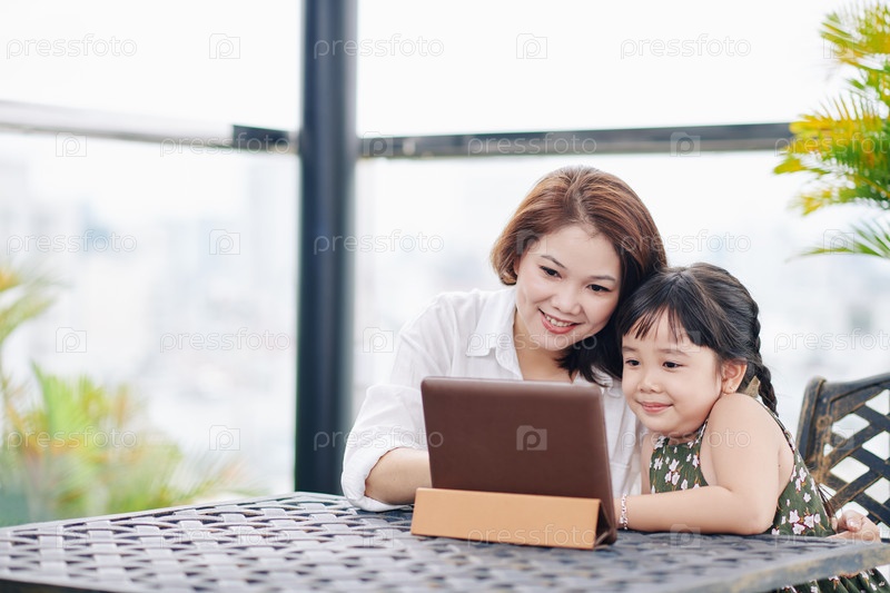 Мать и дочь смотрят мультфильм