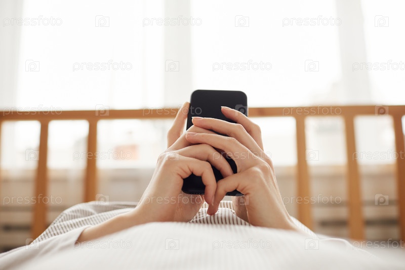 Женщина, использующая мобильный телефон в постели