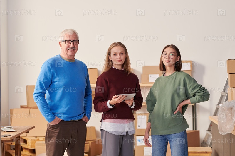 Портрет улыбающегося пожилого человека и молодых женщин в обычных нарядах, стоящих против полки картонных коробок на складе