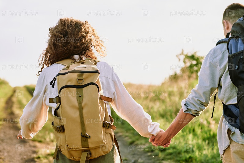 Задний вид молодой женщины, несущей рюкзак и держащей мужа за руку