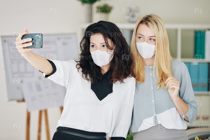 Женщина в медицинской маске фотографирует с коллегой