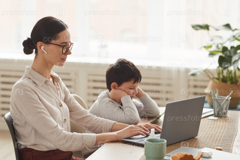 Бизнесвумен в домашнем офисе с сыном
