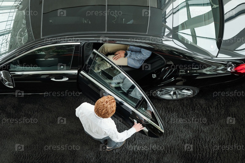 Менеджер по продажам закрывает дверь машины с клиентами внутри перед пробным приводом