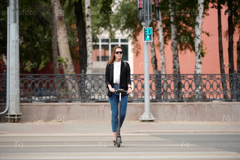 Молодая элегантная женщина стоит на электрическом скутере и движется по пешеходному переходу