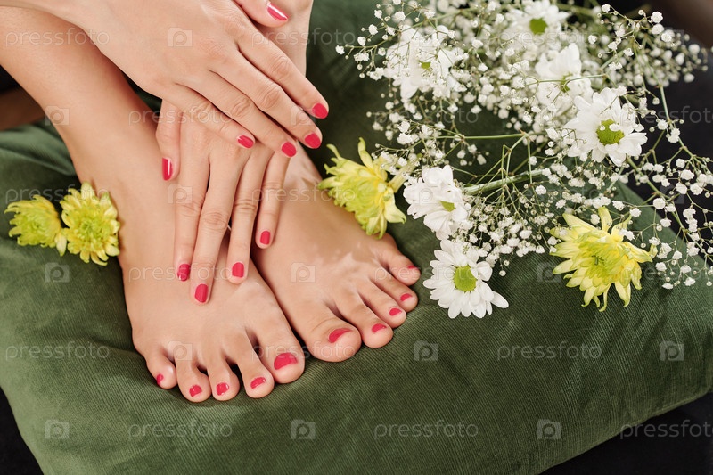 Женщина, касающаяся педикюрированных ног