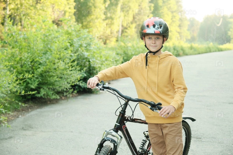 Молодой мальчик в капюшоне, бежевых штанах и защитном шлеме стоит с велосипедом