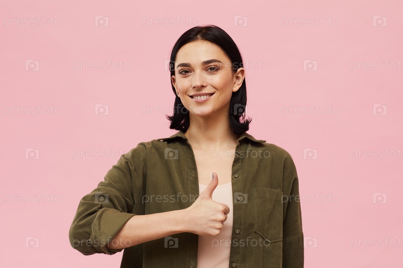 Молодая женщина показывает пальцы вверх