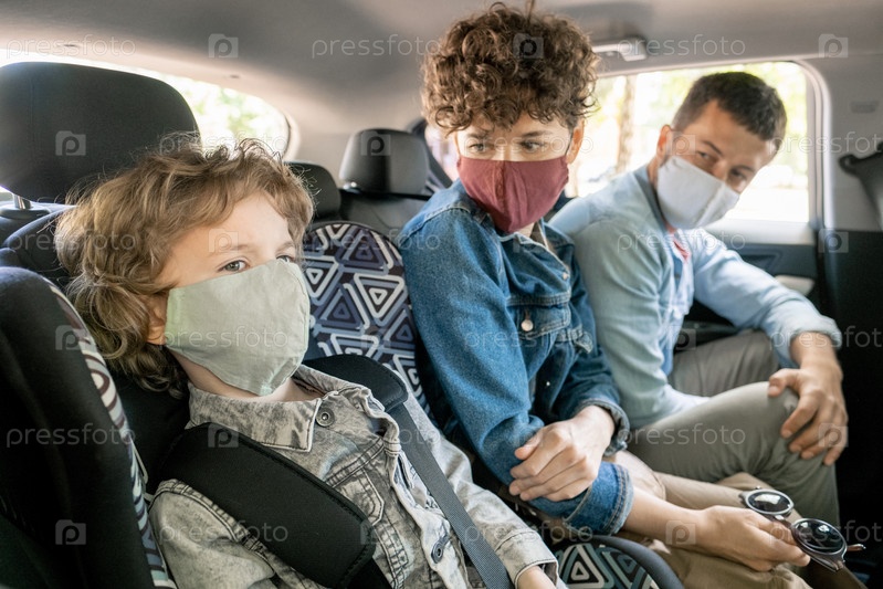 Молодые родители в повседневной одежде и защитных масках разговаривают со своим сыном в машине