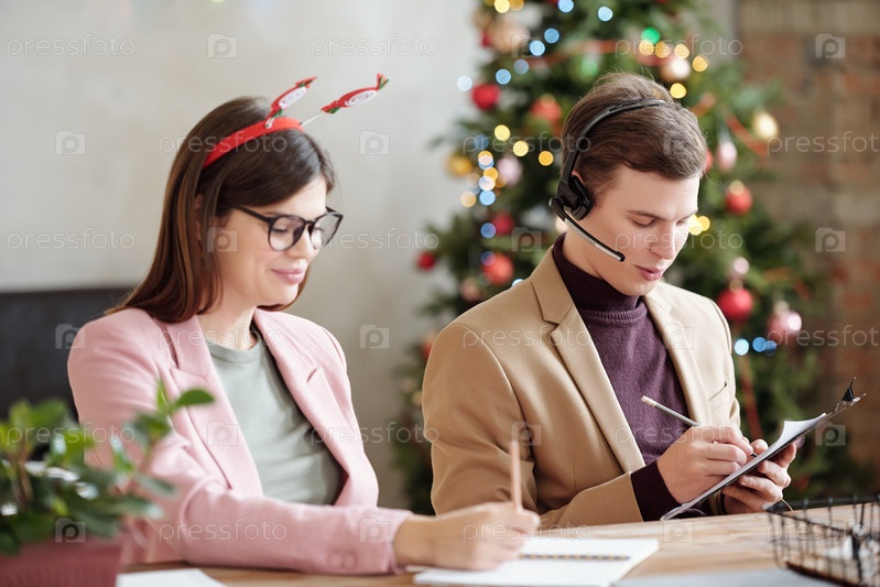 Молодой бизнесмен с гарнитурами делает заметки и консультирует клиентов по коллегам