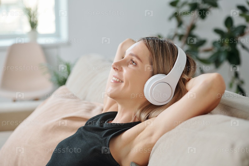 Боковой вид молодой блондинки, улыбающейся женщине в наушниках и наслаждающейся музыкой