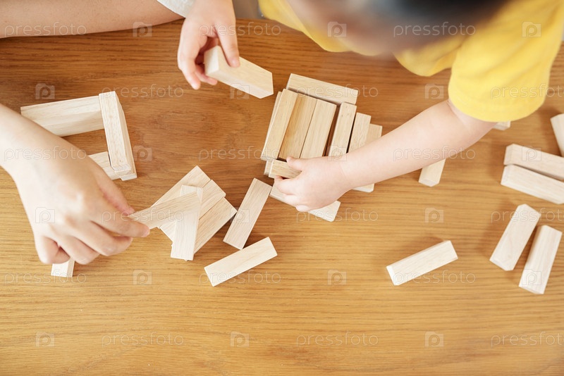 Мать помогает дочери построить башню