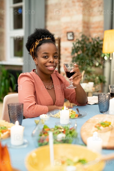 Счастливая молодая африканская женщина, радующаяся бокалом красного вина перед камерой