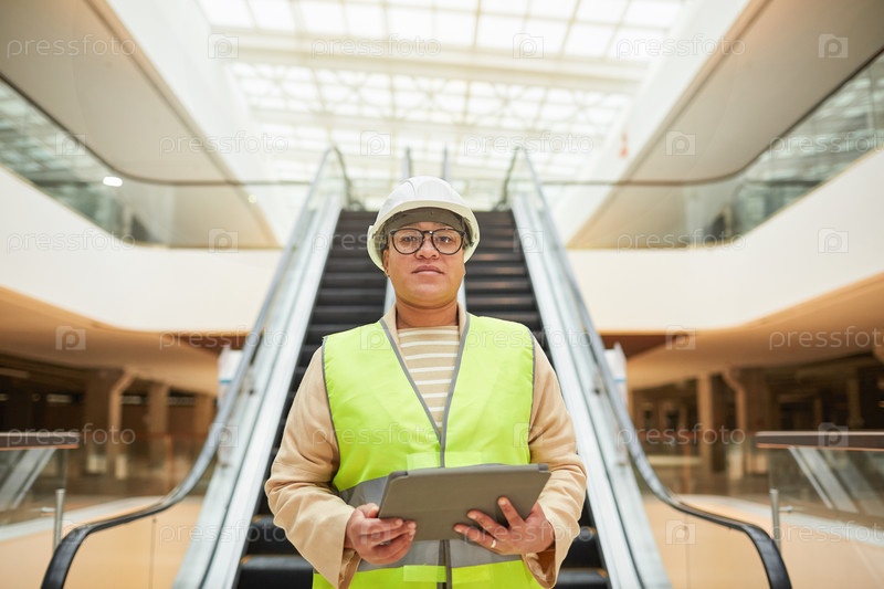 Работница держит планшет на стройплощадке