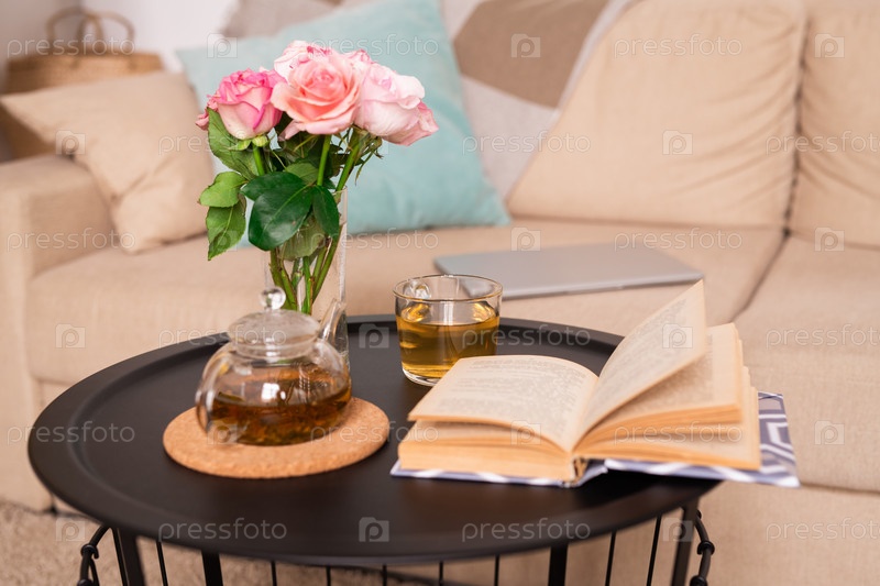 Небольшой стол с букетом роз в стакане воды, зеленым травяным чаем и открытой книгой