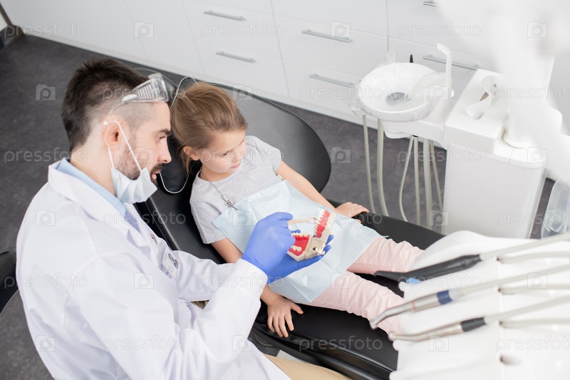 Молодой стоматолог в перчатках и белом халате показывает искусственные зубы маленькой девочке