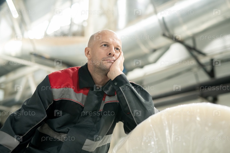 Молодой задумчивый лысый мастер, опирающийся на огромный пакет прокатаной полиэтиленовой пленки