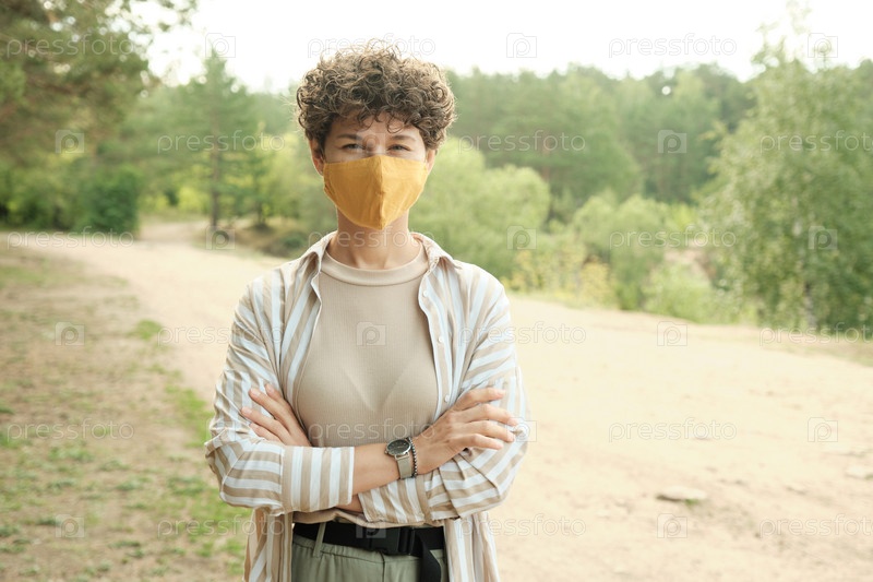 Молодая красивая брюнетка в защитной маске, скрестившая руки за грудь