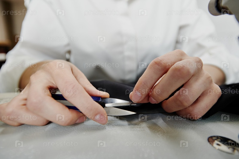 Руки молодой современной швеи или портного режут черную нить