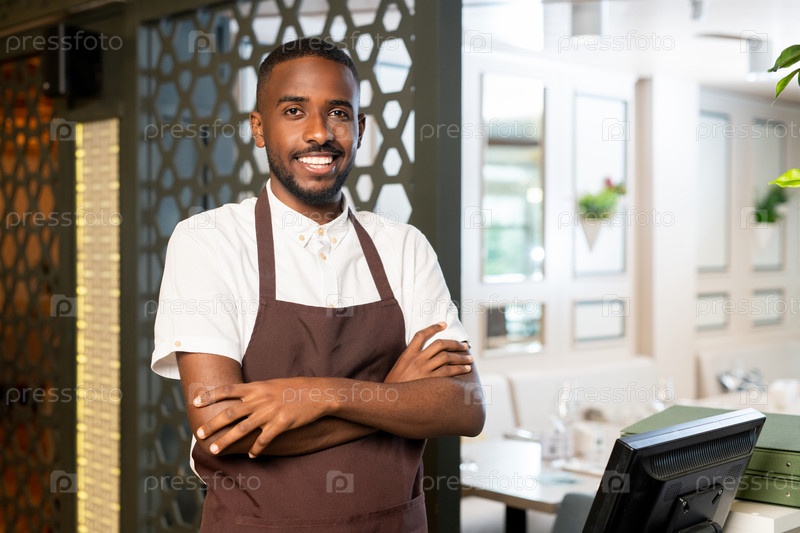 Молодой веселый официант африканской этнической принадлежности в форме смотрит на вас с улыбкой