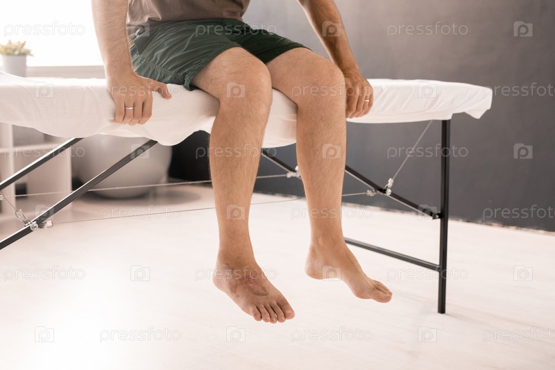Современный спортсмен в активной одежде сидит на медицинском диване в больнице