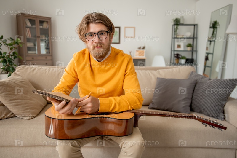 Молодая успешная учительница музыки в повседневной одежде сидит на диване и делает записи
