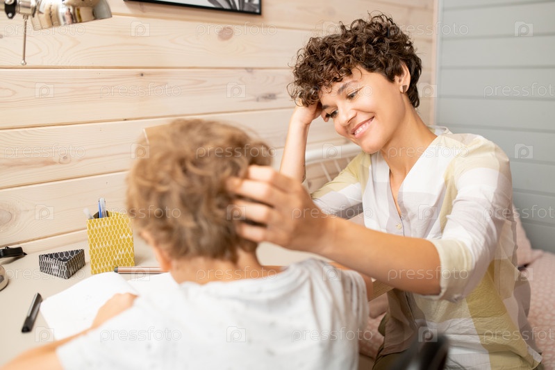 Счастливая молодая мать, касающаяся блондинки и кудрявых волос своего милого маленького сына, рисующего