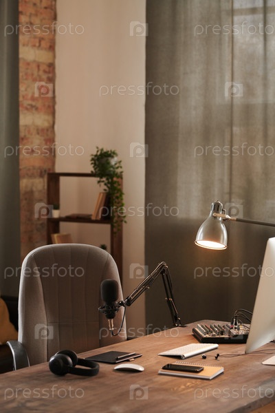 Вертикальный безлюдный снимок современных влогеров рабочее место интерьер на чердаке с компьютером, микрофоном, электрической лампой и наушниками на деревянном столе, пространство для копирования