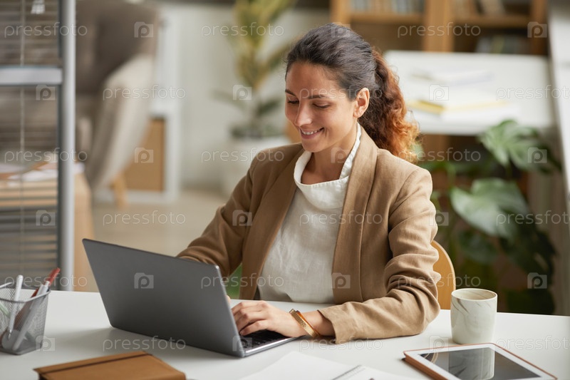 Улыбающаяся деловая женщина, использующая ноутбук на рабочем столе