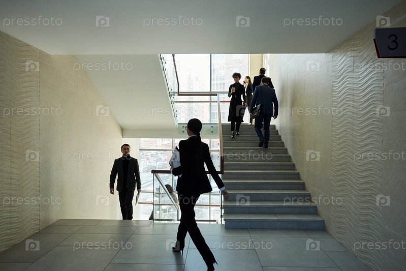 Несколько молодых межкультурных людей в формальной одежде движутся наверх и вперед