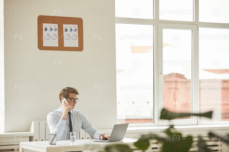 Бизнесмен говорит по смартфону в Белом офисе