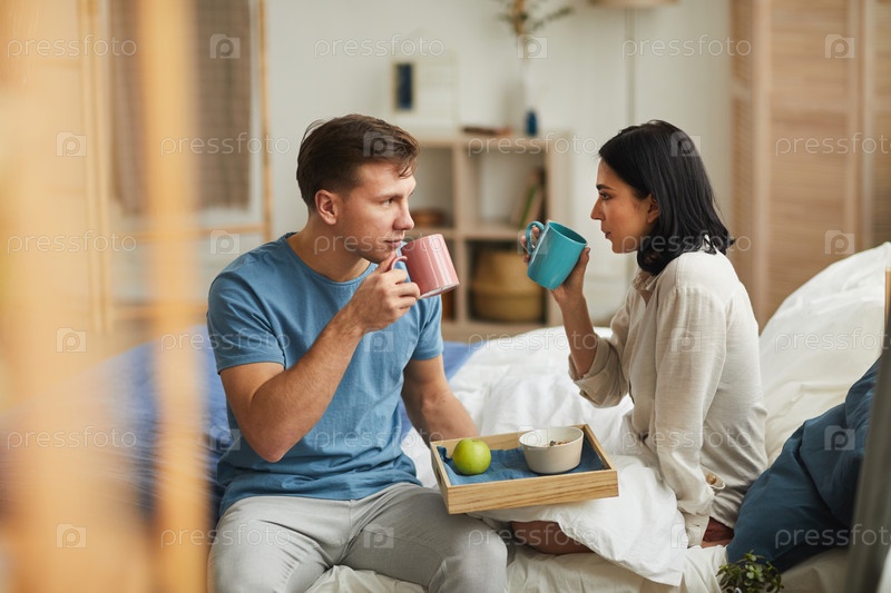 Современная пара наслаждается завтраком в постели