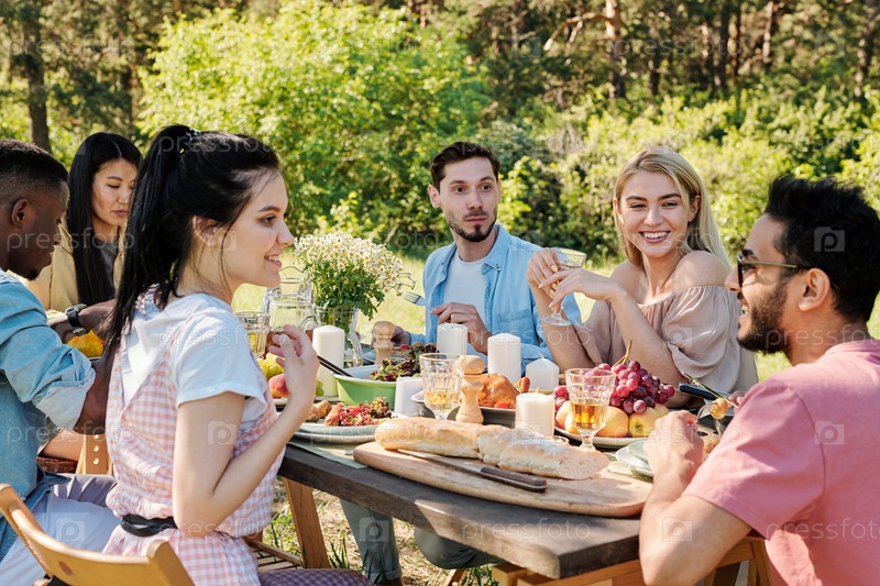 Веселые молодые межкультурные мужчины и женщины в повседневной одежде разговаривают за ужином