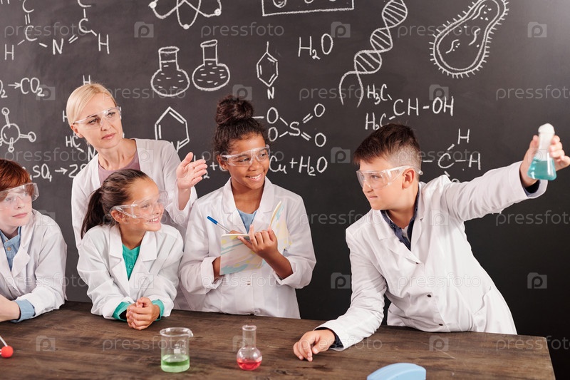 Блондинка учительница и межкультурные школьники смотрят на химическую реакцию в трубке