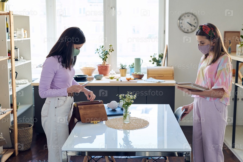 Молодая женщина и ее дочь-подросток в защитных масках стоят за столом