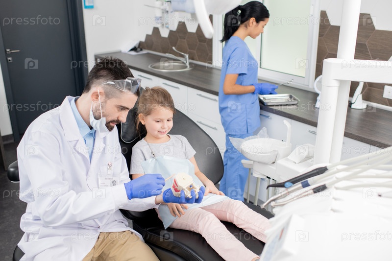 Маленькая девочка сидит в кресле и смотрит на искусственные зубы, которые держит ее стоматолог