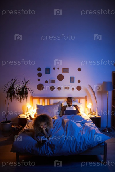 Пара, использующая гаджеты в постели по ночам